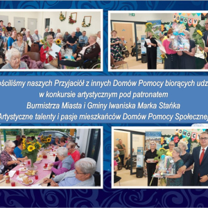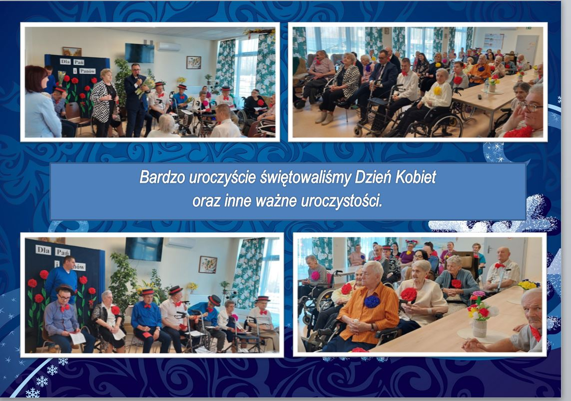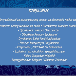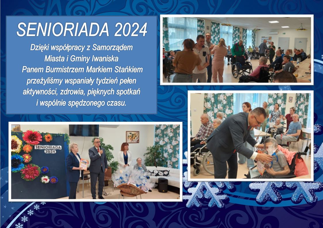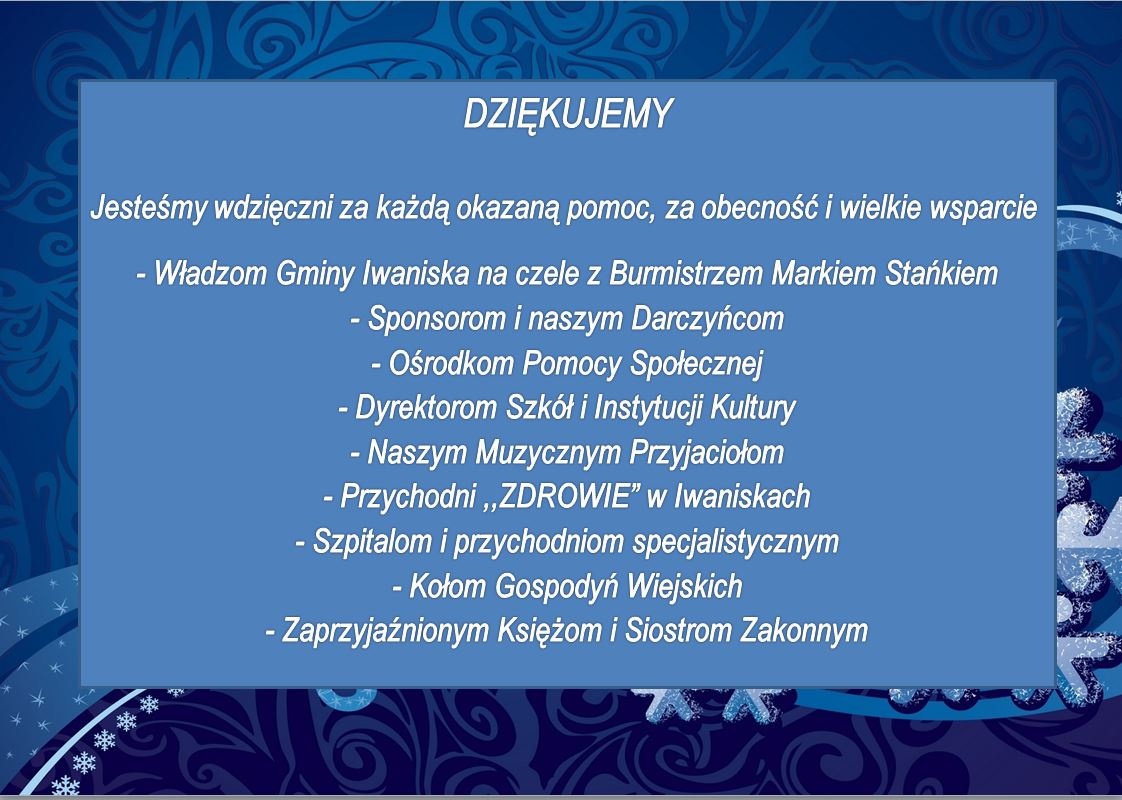 Dziękujemy Władzom Miasta i Gminy Iwaniska na czele z Burmistrzem Markiem Stańkiem za stworzenie tak pięknego Domu, za wsparcie i wyrozumiałość, za każde odwiedziny, upominki i dobre słowo. Dziękujemy naszej Przychodni ,,ZDROWIE" w Iwaniskach oraz szpitalom i całej służbie zdrowia za bardzo dobrą opiekę i pomoc w opiece nad naszymi pacjentami. Dziękujemy za ogromną pomoc i wielkie serce Dyrektorom Szkół, Instytucji Kultury za umilanie nam czasu, za każdy występ, przedstawienie, warsztaty i ofiarowane piękne serduszka. Dziękujemy naszym Wspaniałym i najlepszym PRACOWNIKOM zarówno administracyjnym, jak również pielęgniarkom, opiekunom, terapeutom, pokojowym , sprzątaczkom, kierowcy, pracownikom gospodarczym i oczywiście niezastąpionej i smacznej naszej kuchni. To dzięki Wam nasz Dom jest miejscem ciepłym, radosnym, gdzie dobro rodzi dobro, a uśmiech wita nas na Dzień Dobry,